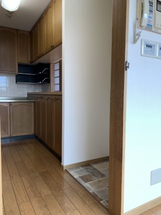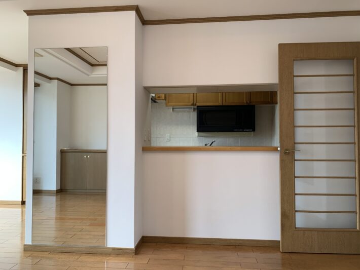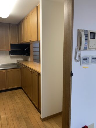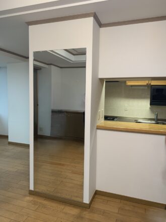 鏡右横部の壁位置を変更し、キッチン側の冷蔵庫置を広げ、カウンターを若干短くしました。巾木と廻縁も整えました。
