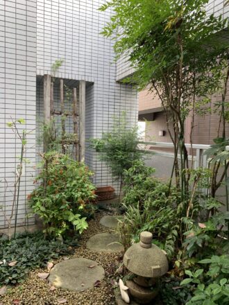 玄関に入った先の障子の向こうには小さな和風庭園があり、